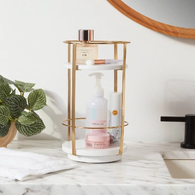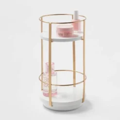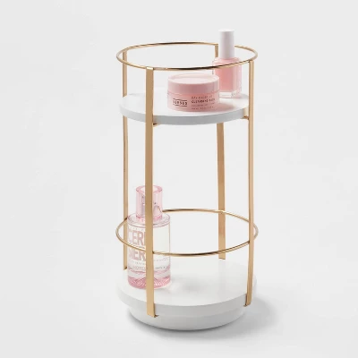 Organize and decorate your home in luxurious style with the Round Metal Countertop Turntable from Brightroomâ„¢. Set on a metal frame, this round storage cart features two shelves for easy organization of your bath accessories, makeup essentials and more. The gold-tone frame complements the white shelves for an eye-catching look. Simply place this metal-frame cart on a tabletop or vanity counter to keep your space organized.