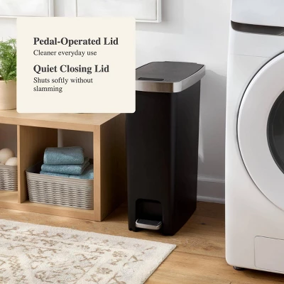 Store trash neatly out of sight in any room with this 45-Liter Slim Resin Step Trash Can with Stainless Steel Band from Brightroomâ„¢. Made from black plastic resin, this trash can also features a stainless steel band with a silver finish below the top. Designed with a tall, slim silhouette, it has a quiet-closing, pedal-operated locking lid for convenient hands-free use.