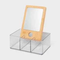 Get ready for the day conveniently using the Cosmetic Storage Container with Bamboo Lid from Brightroomâ„¢. This cosmetic container features divided compartments that provide ample space and organization, as well as a lid with a built-in mirror to make getting ready quick and easy. Made from bamboo and plastic, this rectangle storage dispenser is a practical addition to your vanity.